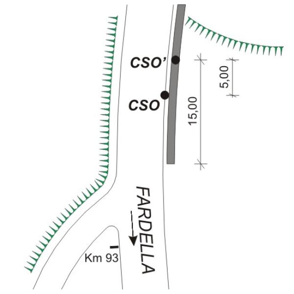[{"simbolo_contrassegno":"B1","materializzazione":"(CSO) – Bullone infisso nel cordolo della cunetta stradale, lato monte a 10 metri dalla testata"},{"simbolo_contrassegno":"B4","materializzazione":"(CSO') – Centrino universale \"ARPAB\" infisso sulla somiit\u00e0 del cordolo suddetto, a 5 metri dal CSO (coincide con 211607)"}]
