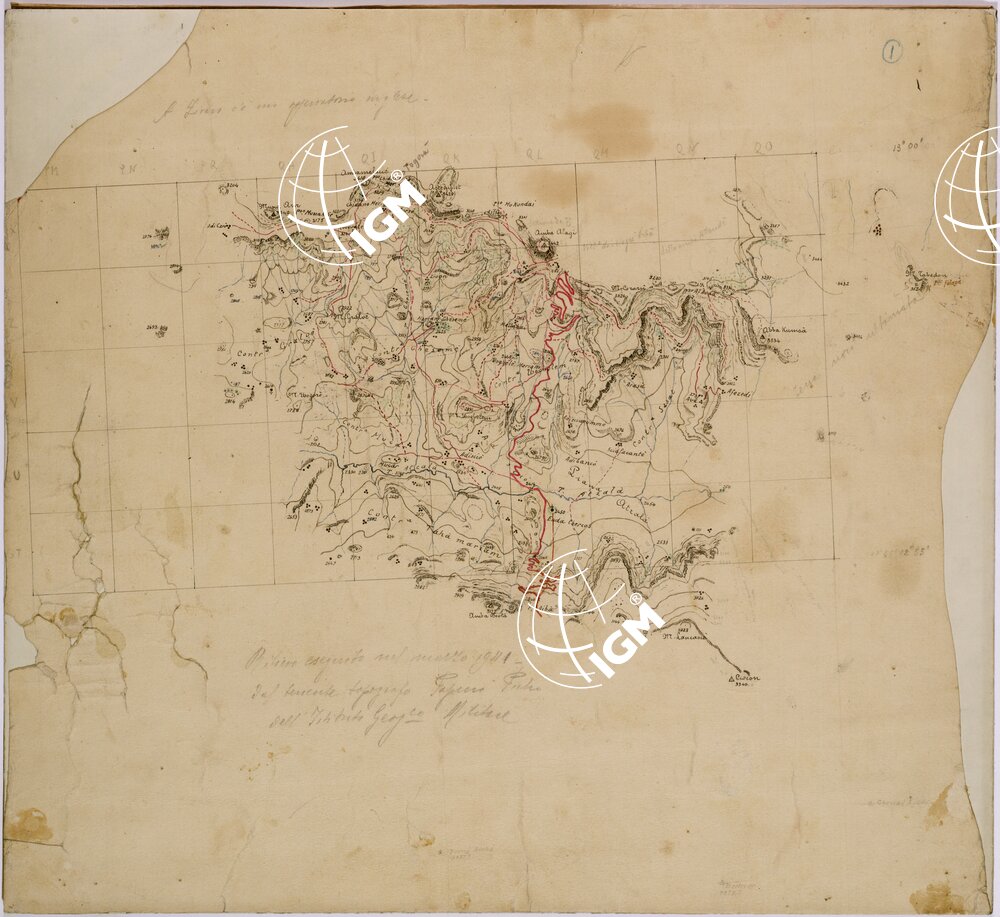 Originale disegnato a penna su carta da disegno montata su cartone del rilievo eseguito dal Topografo Papini Pietro dell’ IGM durante l’ assedio dell’ Amba Alagi e da lui tenuto nascosto fino al suo rientro a Firenze al termine della prigionia.