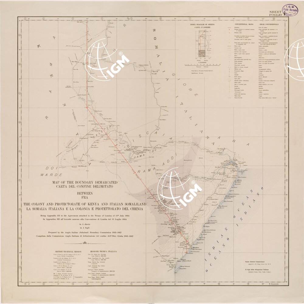 Carta bilingue ( Italiano – Inglese ) in 4 fogli compilata dalla Commissione Anglo – Italiana di delimitazione dei confini, nell' estate 1927 le due delegazioni riunite conclusero i lavori presso l' IGM con la compilazione della relazione descrittiva del confine e della carta. Notizie più dettagliate nella pubblicazione " L' Italia in Africa " del Generale C. Traversi