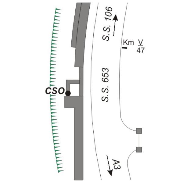 | Contrassegni | [{"simbolo_contrassegno":"B1","materializzazione":"(CSO) – Bullone infisso nel pozzetto, presso il tombino, lato destro direzione A3"}] |