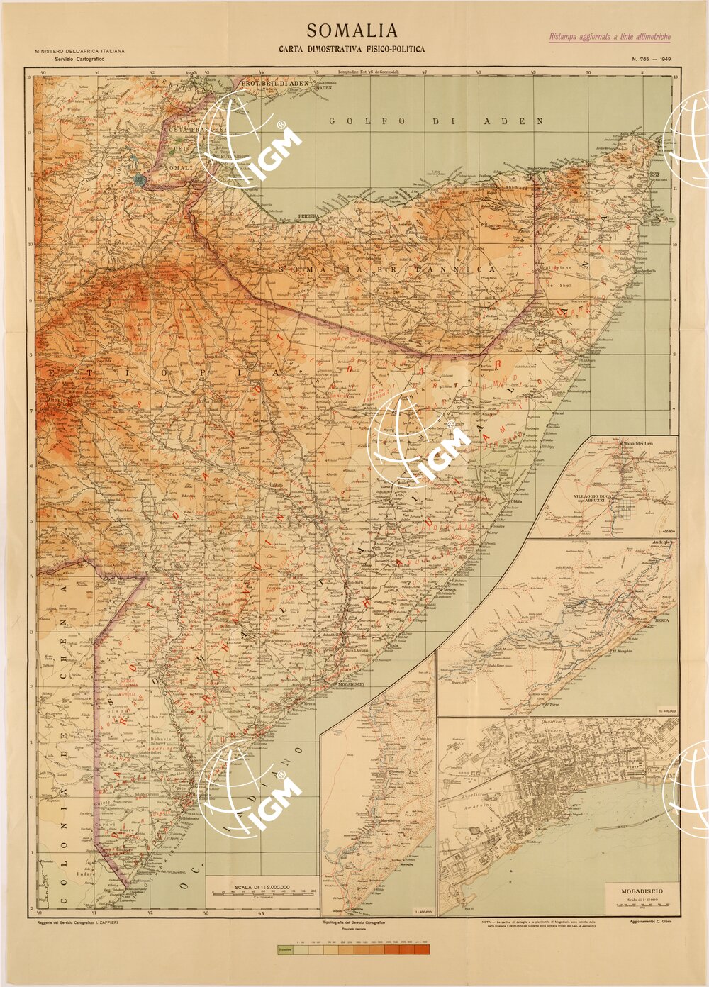 Carta del Servizio Cartografico del Ministero dell’ Africa Italiana, vi sono inseriti 3 riquadri con cartine di dettaglio alla scala di 1:400.000 e una planimetria di Mogadiscio alla scala di 1:12.000 ricavate dalla Carta Itineraria della Somalia alla scala di 1:400.000 del Governo della Somalia.