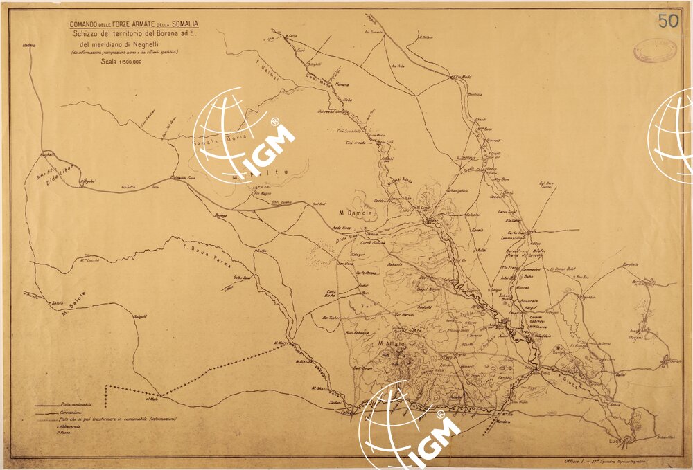 Copia eliografica ricavata da informazioni, ricognizioni aeree e rilievi speditivi dalla 27° Squadra Topocartografica del Comando Forze Armate della Somalia.