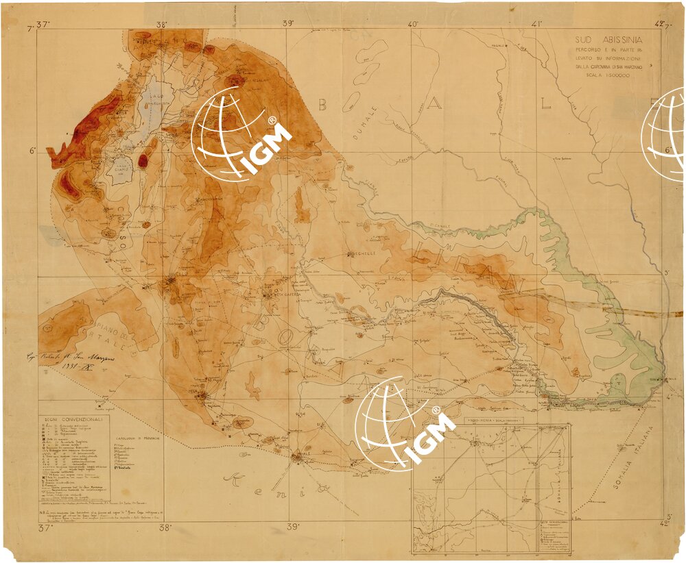 Copia eliografica della zona percorsa e in parte rilevata su informazioni della Carovana di San Marzano, all’ interno un riquadro alla scala di 1:2.000.000 del nord del Kenia.