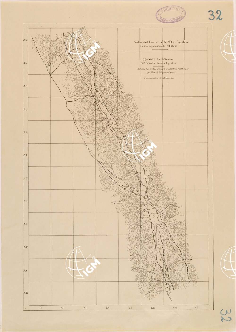 Copia eliografica della 27° Squadra Topocartografica dello schizzo topografico eseguito mediante la restituzione speditiva di fotografie aeree.