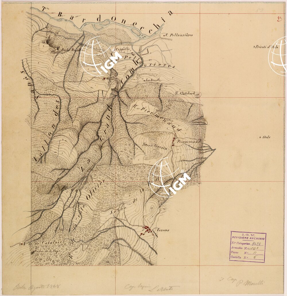 Rilievi eseguiti da Ufficiali della Scuola Superiore di Guerra, disegnati a colori su carta da disegno montata su tela.