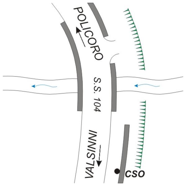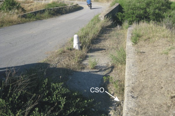 | Contrassegni | [{"simbolo_contrassegno":"B1","materializzazione":"(CSO) – Bullone infisso nel cordolo della cunetta stradale, a 10 metri dal ponte, lato monte"}] |