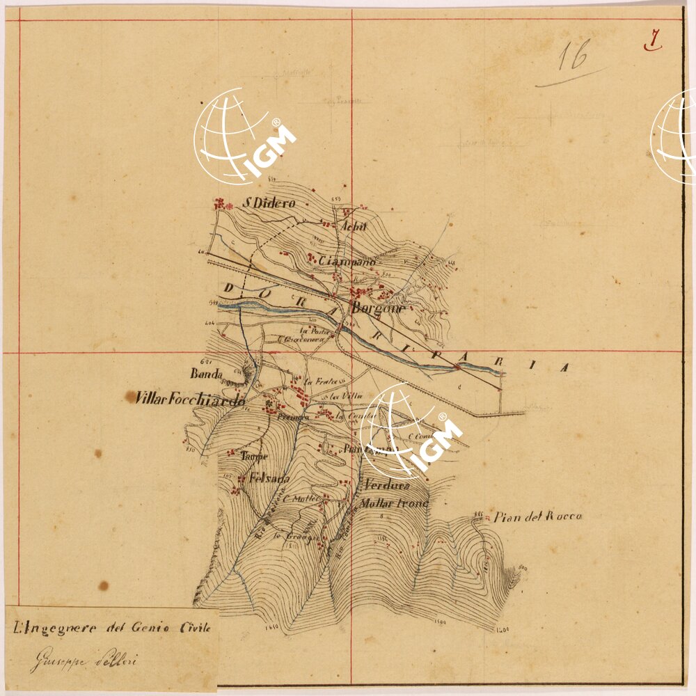 Rilievi eseguiti da Ingegneri del Genio Civile, disegnati a colori su carta da disegno montata su tela.