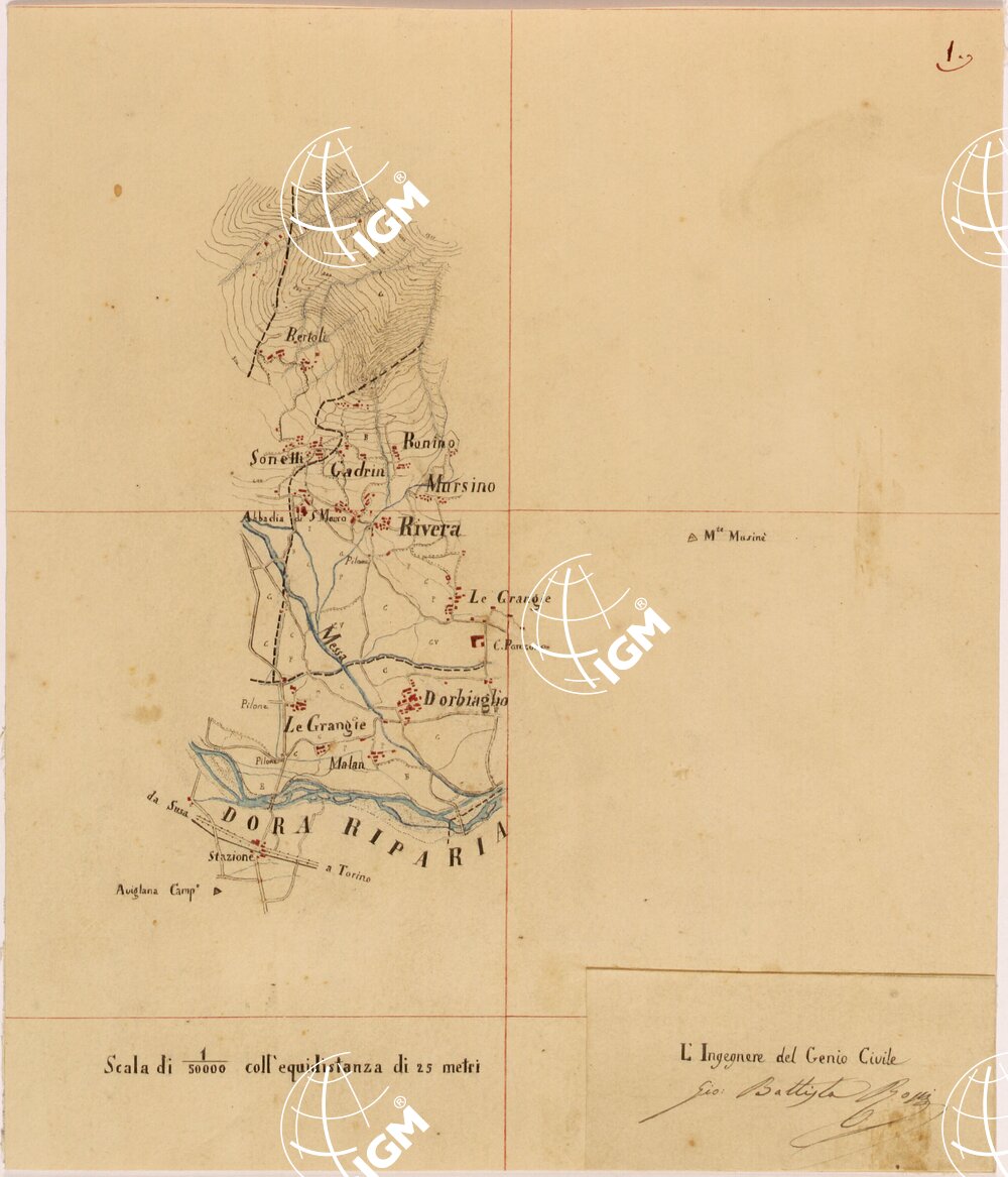 Rilievi eseguiti da Ingegneri del Genio Civile, disegnati a colori su carta da disegno montata su tela.