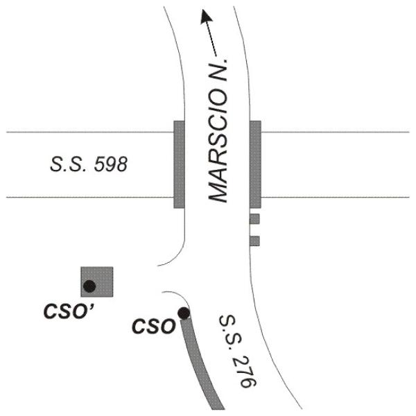 | Contrassegni | [{"simbolo_contrassegno":"B1","materializzazione":"(CSO) – Bullone infisso nella testata del muro di contenimento, lato destro, subito dopo il cavalcavia sulla SS 598"},{"simbolo_contrassegno":"B4","materializzazione":"(CSO') – Centrino universale infisso sul tombino dell'acquedotto, a 8 metri dal CSO"}] |