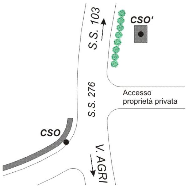 | Contrassegni | [{"simbolo_contrassegno":"B1","materializzazione":"(CSO) – Bullone infisso nel muretto posto sul lato destro direzione Villa d'Agri, in corrispondenza di un incrocio"},{"simbolo_contrassegno":"B4","materializzazione":"(CSO') – Centrino universale infisso sulla soletta in calcestruzzo di un grosso tombino posto vicino al palo ENEL, lato sinistro direzione Villa d'Agri"}] |