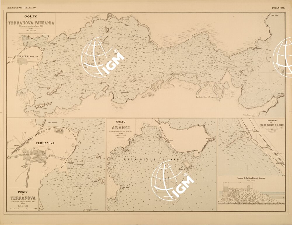 ALBUM DEI PORTI MARITTIMI DEL REGNO D’ITALIA – TAVOLA 43 – GOLFI DI TERRANOVA PAUSANIA – ARANCI – PORTO DI TERRANOVA – APPRODO DELLA BAIA DEGLI ARANCI