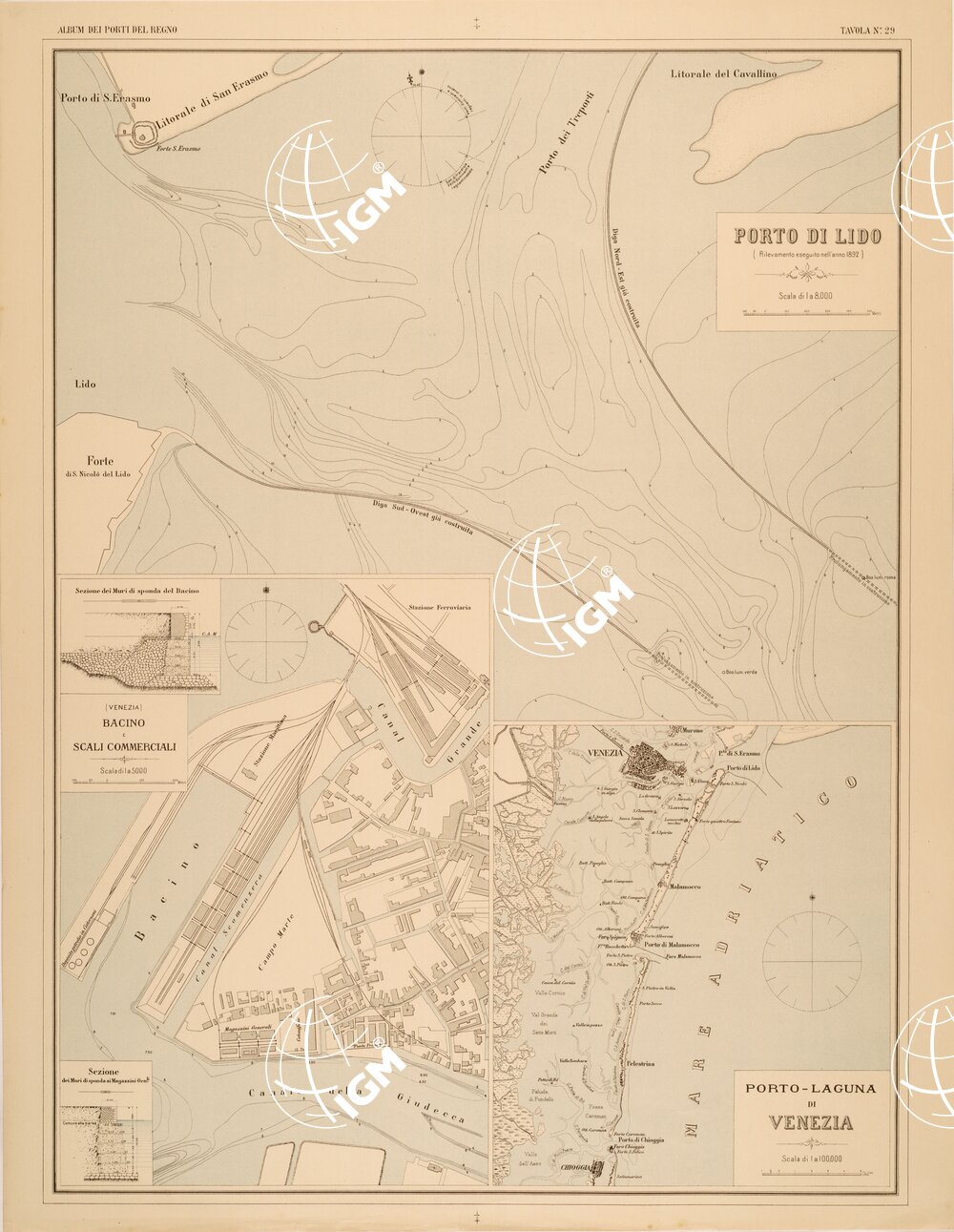 ALBUM DEI PORTI MARITTIMI DEL REGNO D’ITALIA – TAVOLA 29 – PORTO DI LIDO – BACINO E SCALI COMMERCIALI DI VENEZIA – PORTO LAGUNA DI VENEZIA