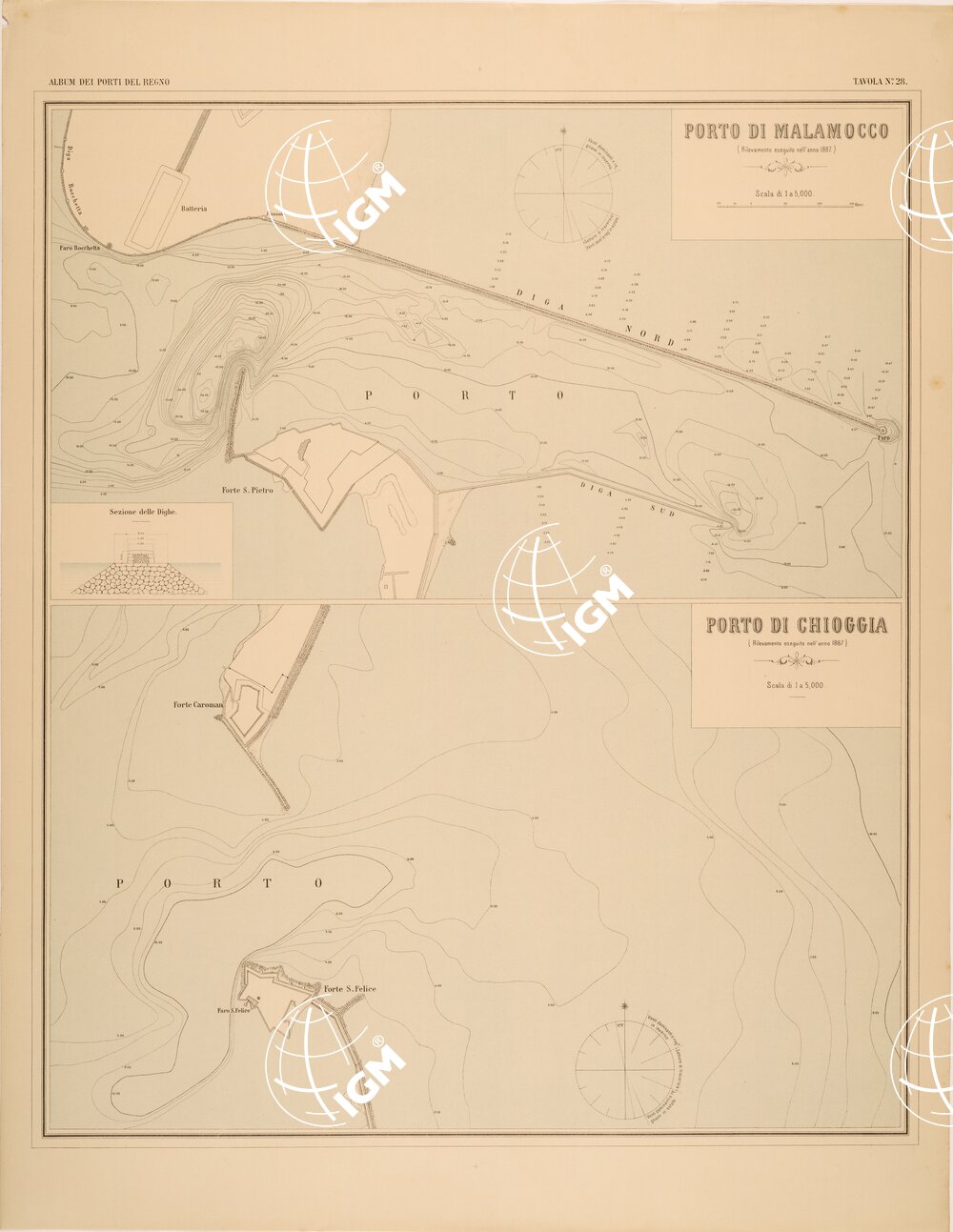 ALBUM DEI PORTI MARITTIMI DEL REGNO D’ITALIA – TAVOLA 28 – PORTI DI MALAMOCCO – CHIOGGIA