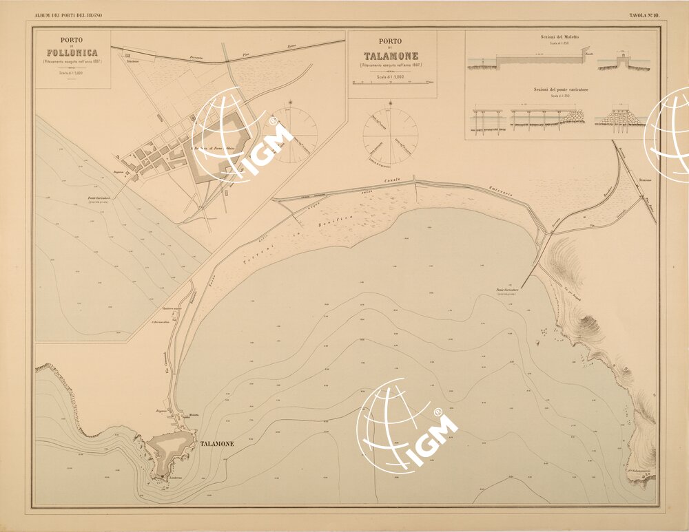 ALBUM DEI PORTI MARITTIMI DEL REGNO D’ITALIA – TAVOLA 10 – PORTI DI FOLLONICA – TALAMONE
