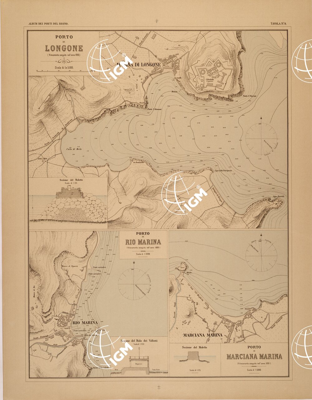 ALBUM DEI PORTI MARITTIMI DEL REGNO D’ITALIA – TAVOLA 09 – PORTI DI LONGONE – RIO MARINA – MARCIANA MARINA