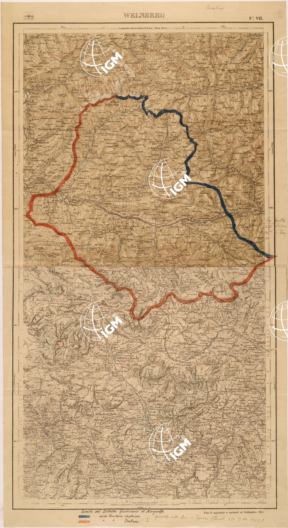 Carta disegnata sopra a due fogli della carta d’ Italia alla scala di 1:100.000 foglio 4 Dobbiaco e foglio 12 Cortina d’ Ampezzo, riporta i limiti territoriali del Distretto Giudiziario di Monguelfo, passato alla divisione di Treviso ( circolare 150 IGM 1923 )