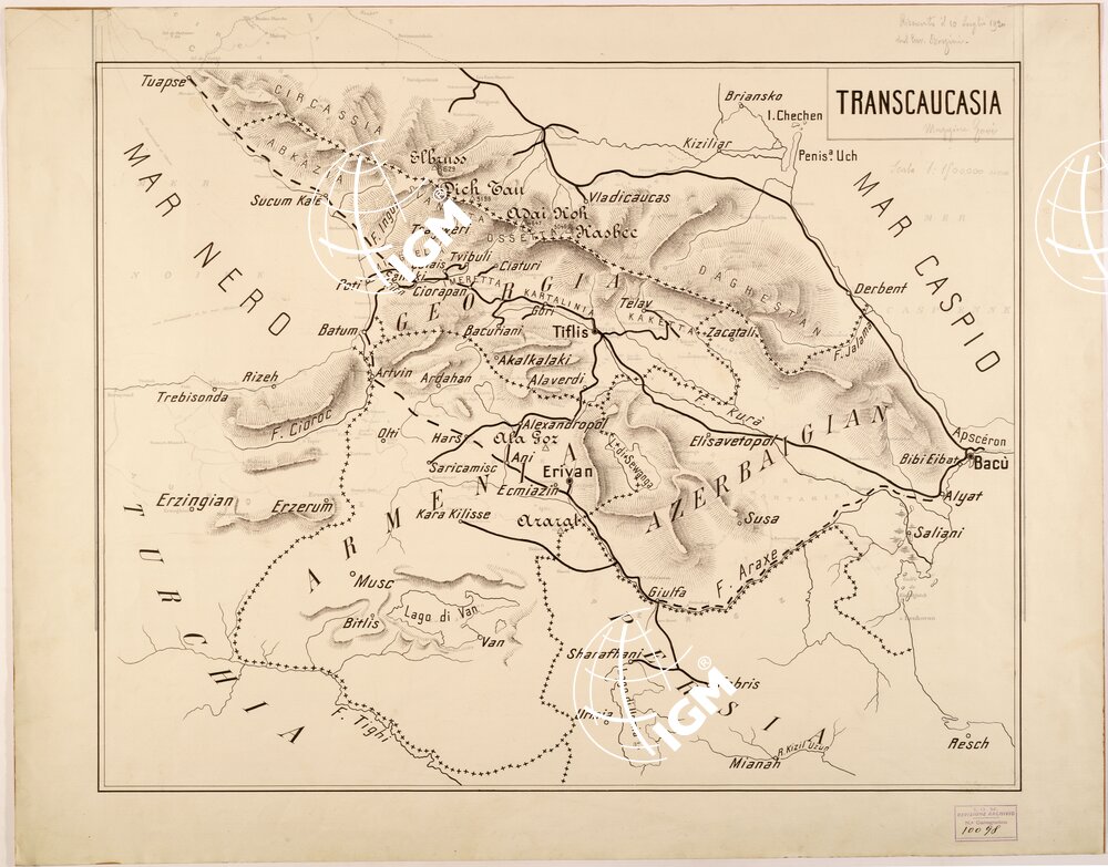 Carta realizzata nel 1920 dalla divisione cartografica dell’ IGM rappresentante il territorio compreso fra il Mar Caspio ed il Mar Nero.