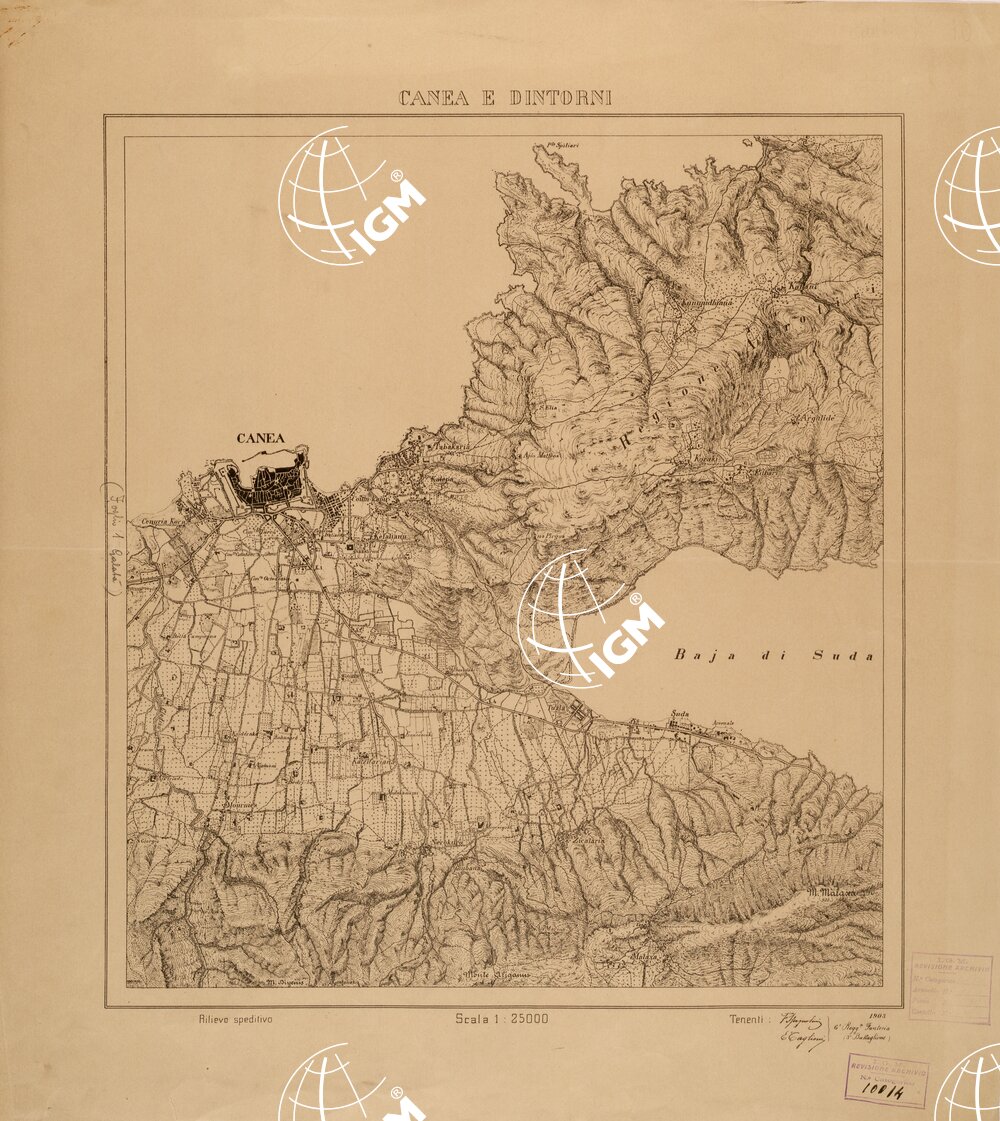 Rilievo speditivo eseguito dal contingente Italiano di presidio durante l’ occupazione dell’ Isola di Creta, la costa fù ricavata da una carta idrografica della Regia Marina Inglese.