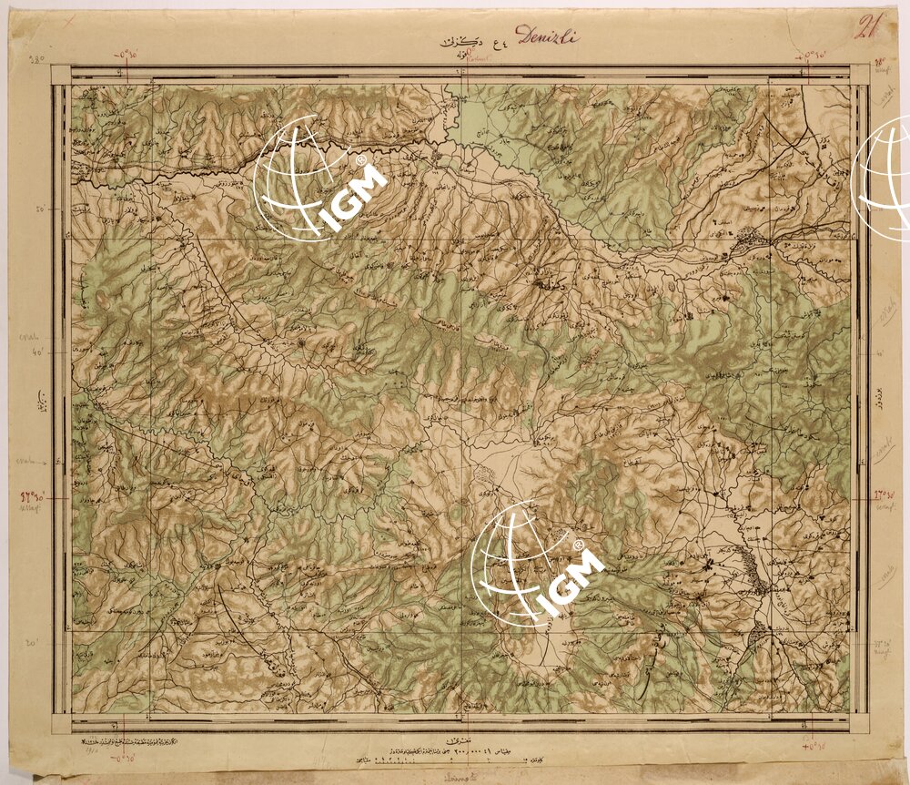 Carta Turca compilata negli anni dal 1909 al 1916 e stampata nella tipografia della sezione cartografica nel 1917 su alcuni fogli è sovrapposto un lucido con la traduzione Italiana della toponomastica.