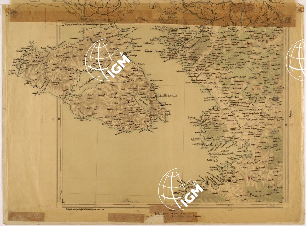 Carta Turca compilata negli anni dal 1909 al 1916 e stampata nella tipografia della sezione cartografica nel 1917 su alcuni fogli è sovrapposto un lucido con la traduzione Italiana della toponomastica.