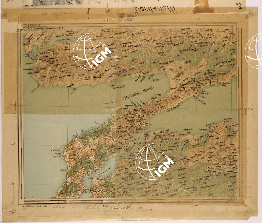 Carta Turca compilata negli anni dal 1909 al 1916 e stampata nella tipografia della sezione cartografica nel 1917 su alcuni fogli è sovrapposto un lucido con la traduzione Italiana della toponomastica.