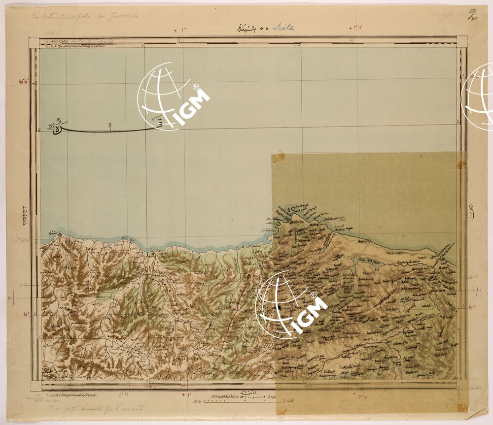 Carta Turca compilata negli anni dal 1909 al 1916 e stampata nella tipografia della sezione cartografica nel 1917 su alcuni fogli è sovrapposto un lucido con la traduzione Italiana della toponomastica.