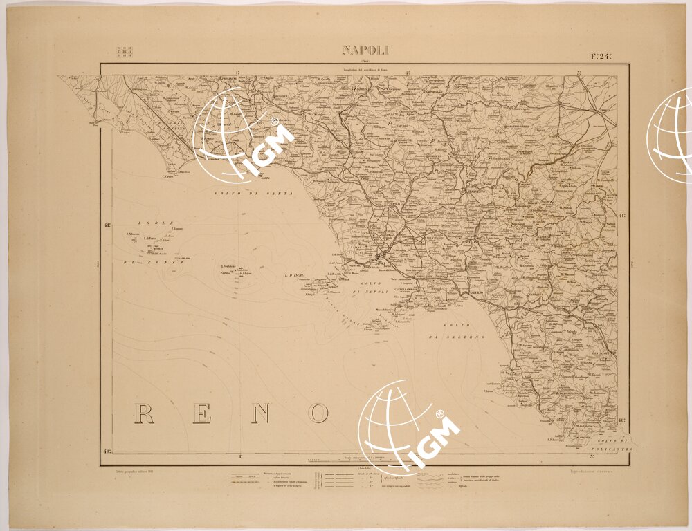 Carta a cura della Divisione Artistica dell’I.G.M.I. compilazione iniziata nel 1883. Stampa in nero eseguita da lastre di rame. Priva di curve di livello e sfumo, nei mari sono state inserite le curve batimetriche. Proiezione di Bonne.