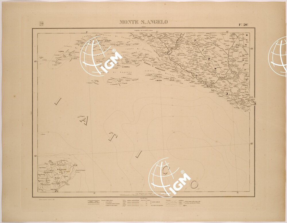Carta a cura della Divisione Artistica dell’I.G.M.I. compilazione iniziata nel 1883. Stampa in nero eseguita da lastre di rame. Priva di curve di livello e sfumo, nei mari sono state inserite le curve batimetriche. Proiezione di Bonne.