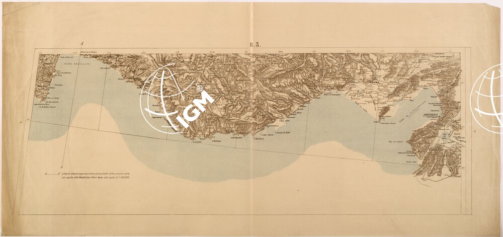 Carta in 5 fogli realizzata dalla divisione cartografica dell’ IGM nel 1896 usando come fonte di compilazione una carta Turca del 1870 aggiornata nel 1878 nel foglio A2 sono riportati il titolo della carta il quadro d’ unione e i segni convenzionali.