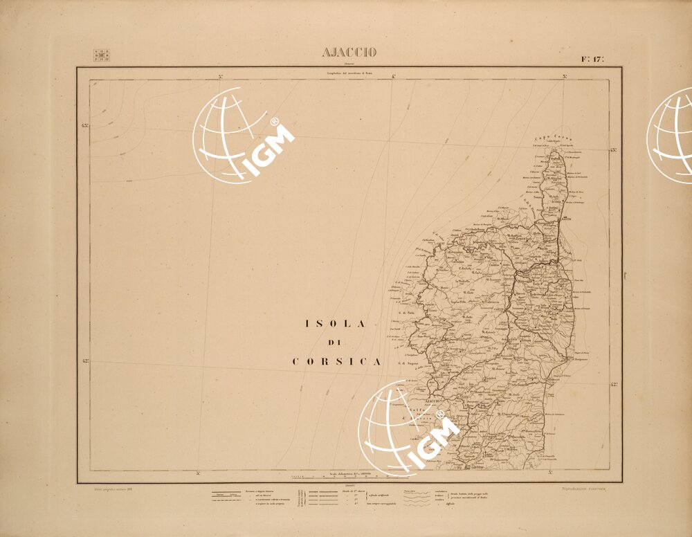 Carta a cura della Divisione Artistica dell’I.G.M.I. compilazione iniziata nel 1883. Stampa in nero eseguita da lastre di rame. Priva di curve di livello e sfumo, nei mari sono state inserite le curve batimetriche. Proiezione di Bonne.
