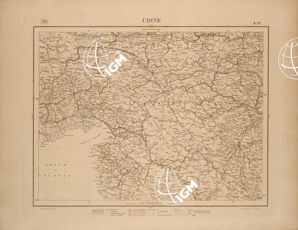 Carta a cura della Divisione Artistica dell’I.G.M.I. compilazione iniziata nel 1883. Stampa in nero eseguita da lastre di rame. Priva di curve di livello e sfumo, nei mari sono state inserite le curve batimetriche. Proiezione di Bonne.