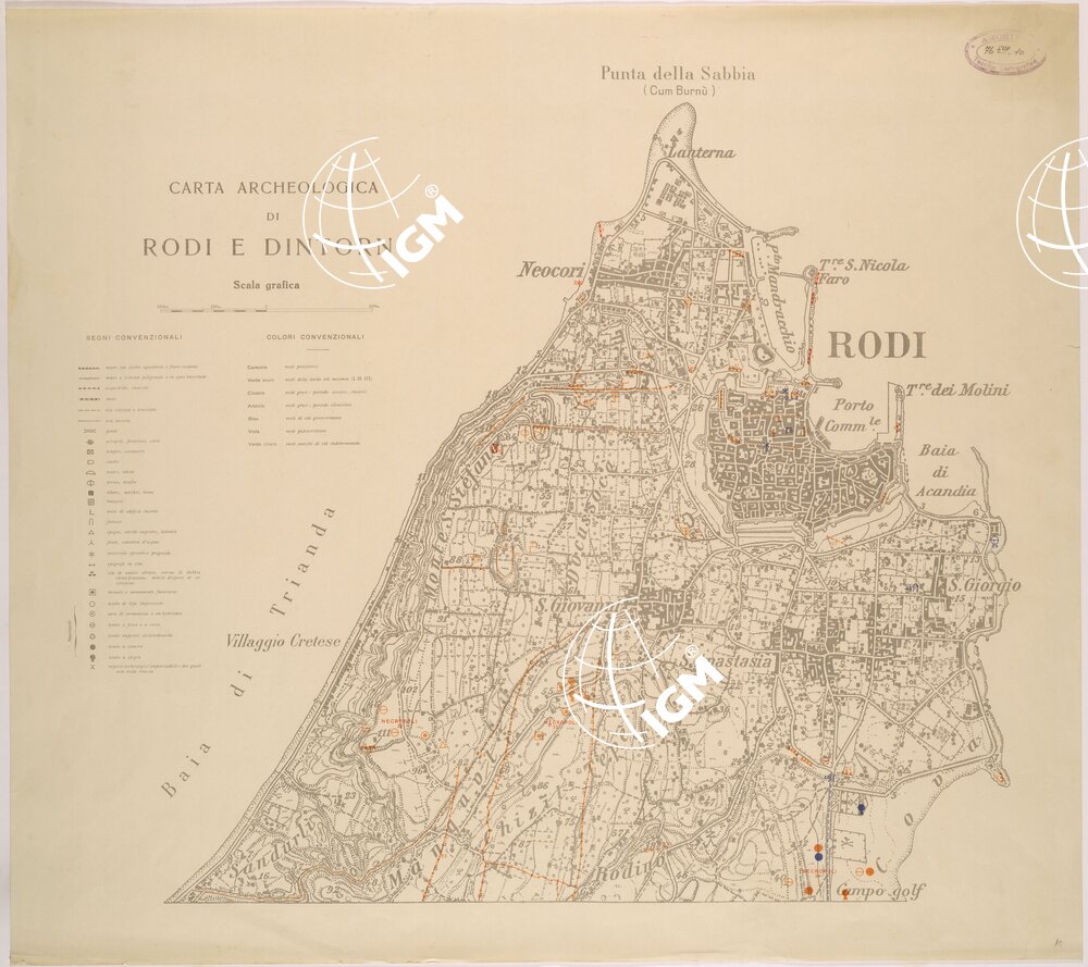 Ingrandimento del rilievo diretto al 25.000 del 1922. Proiezione naturale. Equidistanza delle curve di livello m.10. Sulla carta è rappresentata una legenda con i segni convenzionali archeologici.
