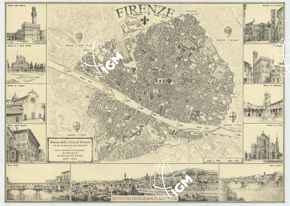 Documento cartografico disegnato a mano su carta pergamenata a china e matita, contenente la planimetria attuale del centro cittadino, con gli stemmi dei quattro quartieri storici della città di Firenze ed intorno ad esso le immagini più significative del capoluogo Toscano.