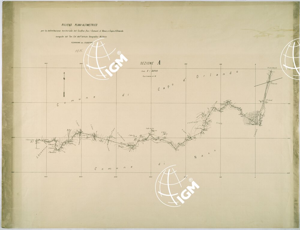RILIEVO PLANI-ALTIMETRICO PER LA DELINEAZIONE DEL CONFINE FRA I COMUNI DI NASO E CAPO D'ORLANDO ESEGUITO DAL TEN COL. DELL'ISTITUTO GEOGRAFICO MILITARE FERRARA CAV. GIUSEPPE – SEZIONE A.