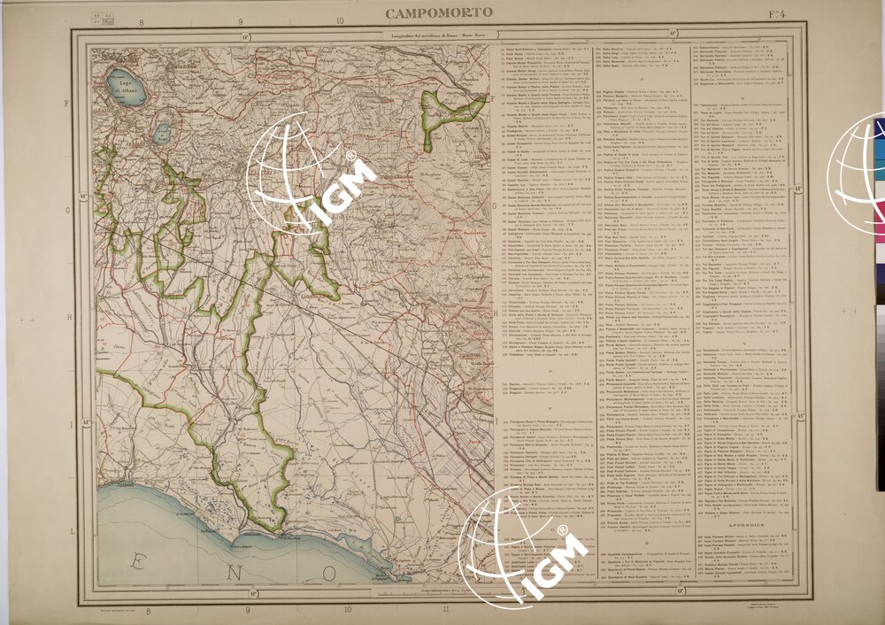 | Titolo proprio | CARTA DELL'AGRO ROMANO IN QUATTRO FOGLI COI CONFINI DELLE TENUTE E DEI TERRITORI COMUNALI LIMITROFI ALLA SCALA DI 1:75,000 DELINEATA SULLE CARTE DELL'ISTITUTO GEOGRAFICO MILITARE DAL CAV. AGR. POMPEO SPINETTI – FOGLIO 4. |
