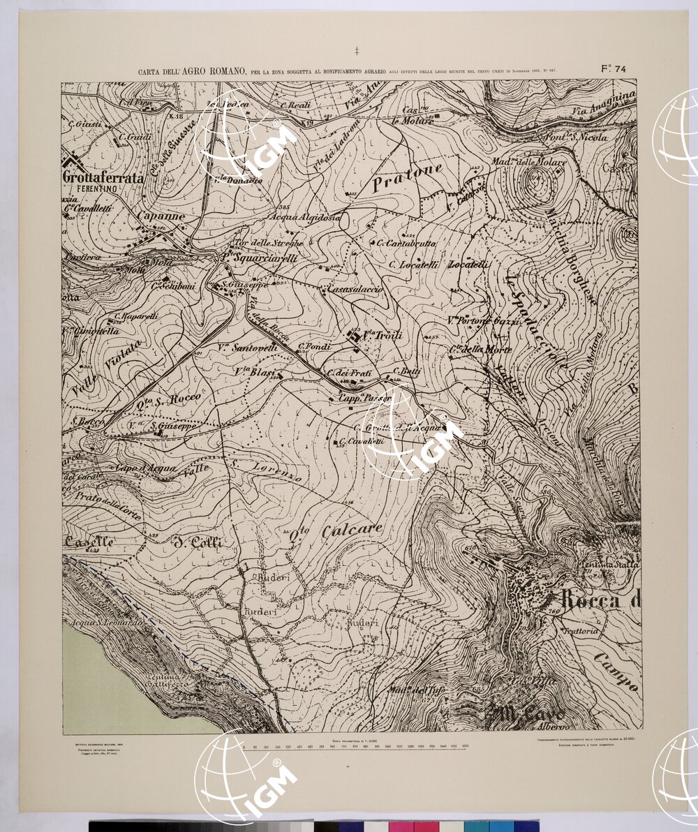 | Titolo proprio | CARTA DELL'AGRO ROMANO NEL RAPPORTO DI 1:8.000 PER LA ZONA SOGGETTA AL BONIFICAMENTO AGRARIO AGLI EFFETTI DELLE LEGGI RIUNITE IN TESTO UNICO CON R.D. 10 NOVEMBRE 1905 N°647 – FOGLIO 74. |