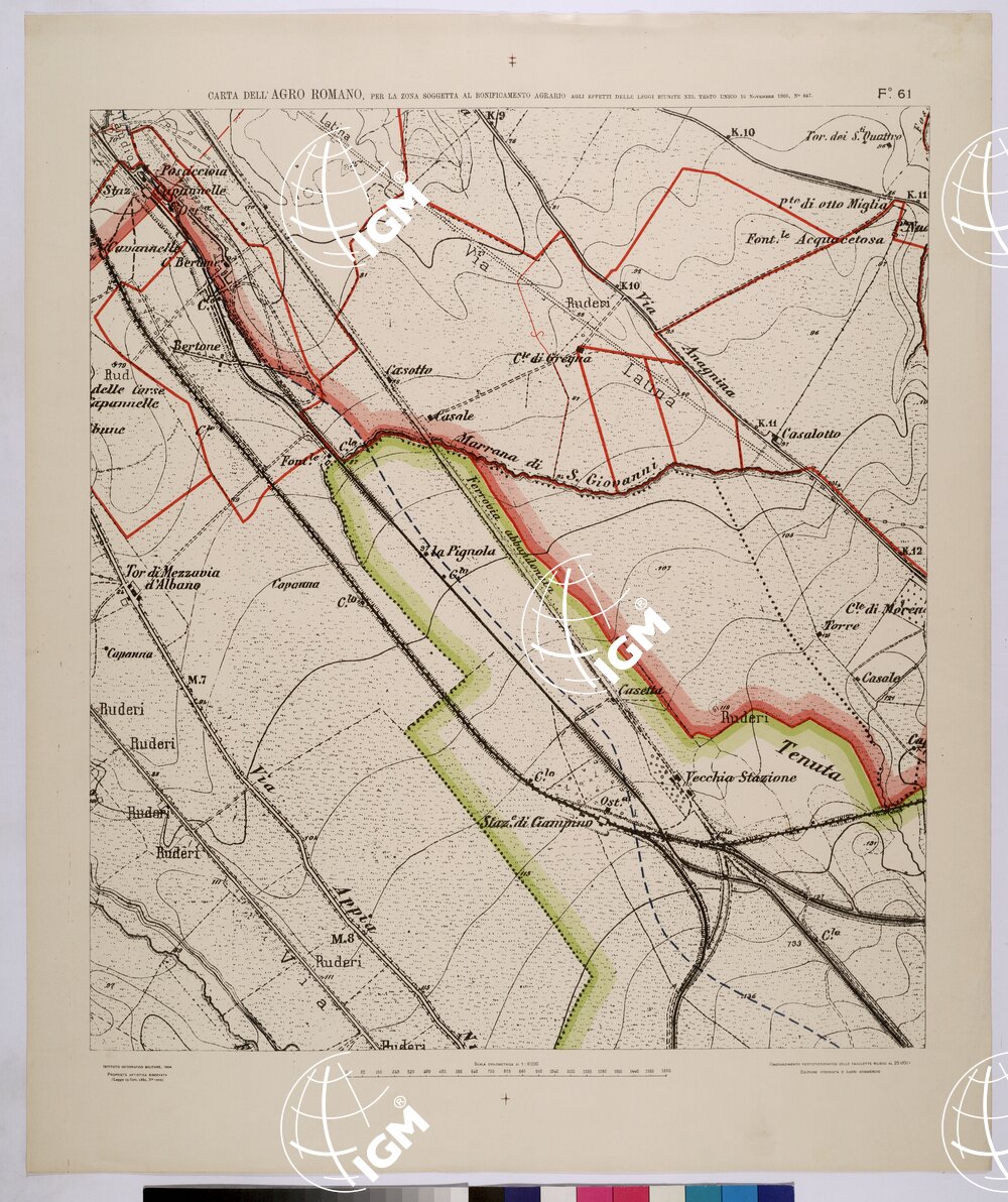 | Titolo proprio | CARTA DELL'AGRO ROMANO NEL RAPPORTO DI 1:8.000 PER LA ZONA SOGGETTA AL BONIFICAMENTO AGRARIO AGLI EFFETTI DELLE LEGGI RIUNITE IN TESTO UNICO CON R.D. 10 NOVEMBRE 1905 N°647 – FOGLIO 61. |