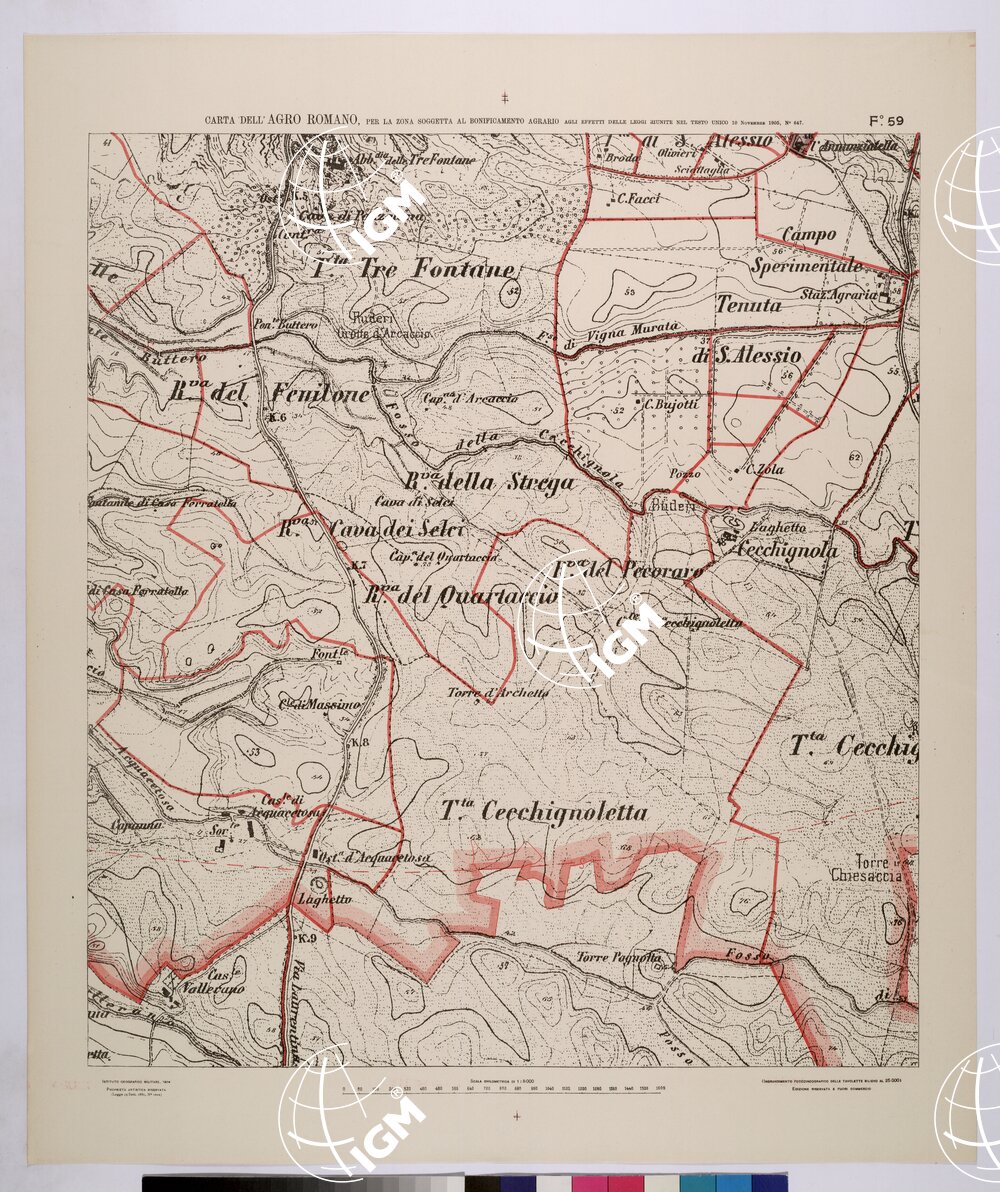 CARTA DELL’AGRO ROMANO NEL RAPPORTO DI 1:8.000 PER LA ZONA SOGGETTA AL BONIFICAMENTO AGRARIO AGLI EFFETTI DELLE LEGGI RIUNITE IN TESTO UNICO CON R.D. 10 NOVEMBRE 1905 N°647 – FOGLIO 59.
