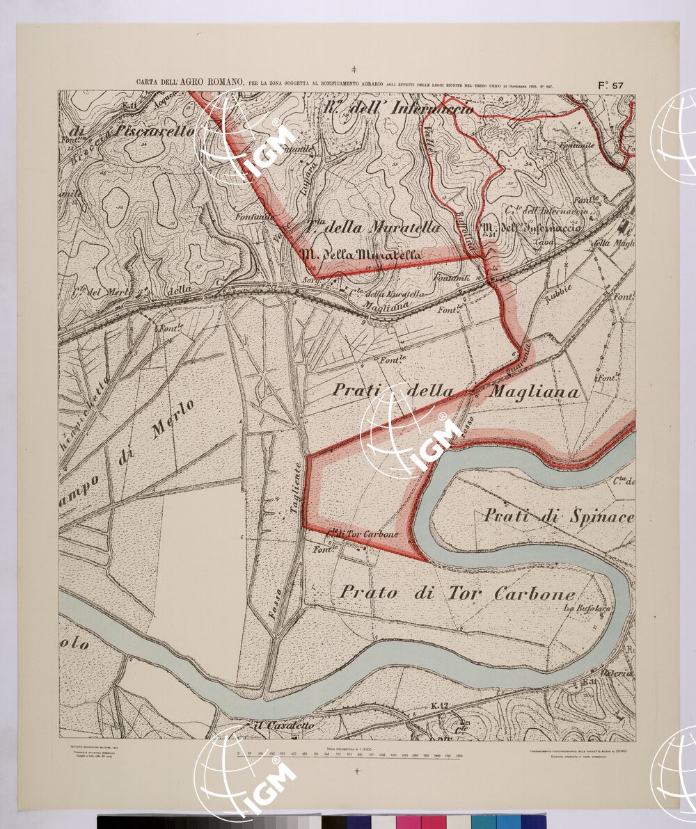 | Titolo proprio | CARTA DELL'AGRO ROMANO NEL RAPPORTO DI 1:8.000 PER LA ZONA SOGGETTA AL BONIFICAMENTO AGRARIO AGLI EFFETTI DELLE LEGGI RIUNITE IN TESTO UNICO CON R.D. 10 NOVEMBRE 1905 N°647 FOGLIO 57. |