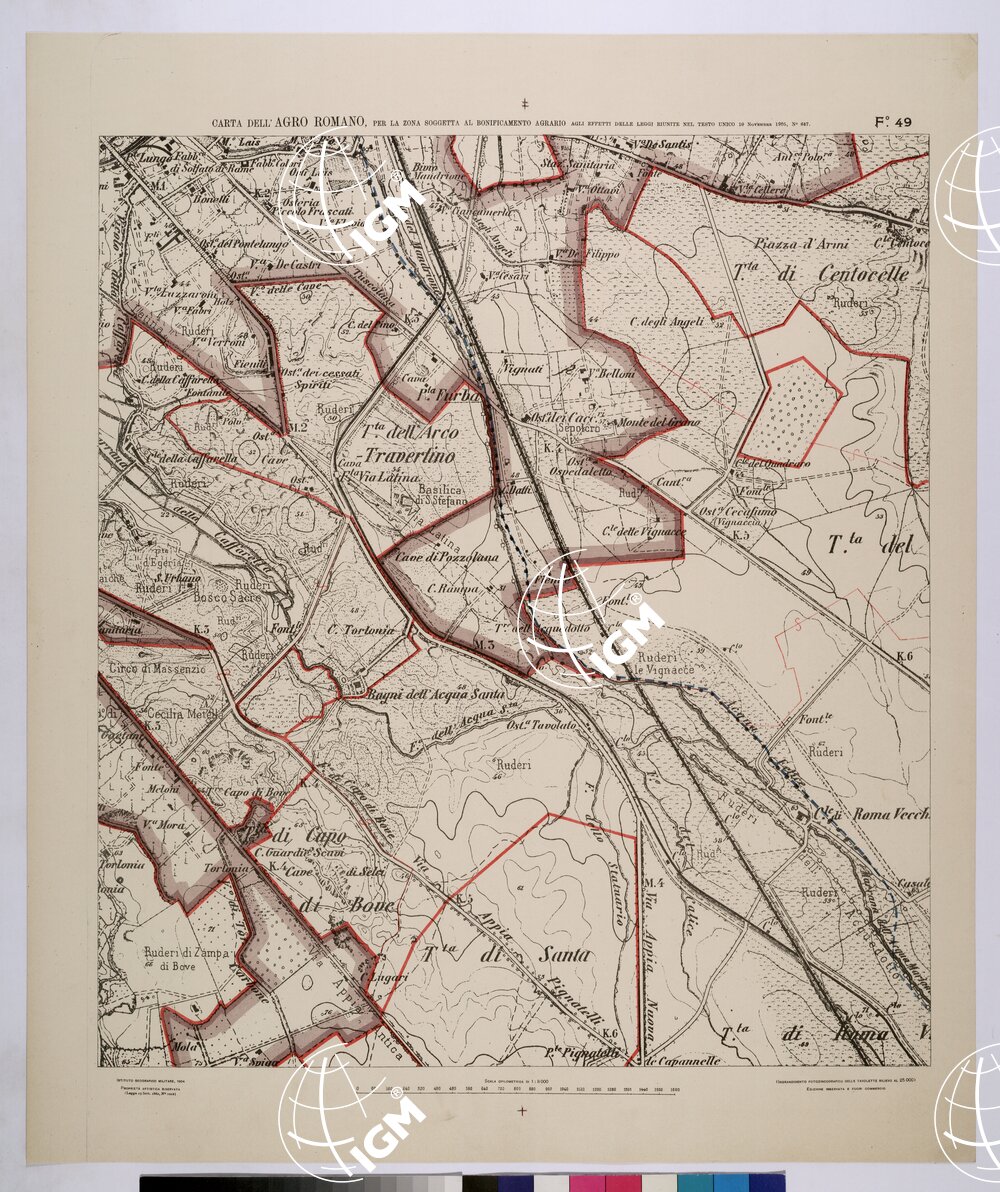 | Titolo proprio | CARTA DELL'AGRO ROMANO NEL RAPPORTO DI 1:8.000 PER LA ZONA SOGGETTA AL BONIFICAMENTO AGRARIO AGLI EFFETTI DELLE LEGGI RIUNITE IN TESTO UNICO CON R.D. 10 NOVEMBRE 1905 N°647 – FOGLIO 49. |