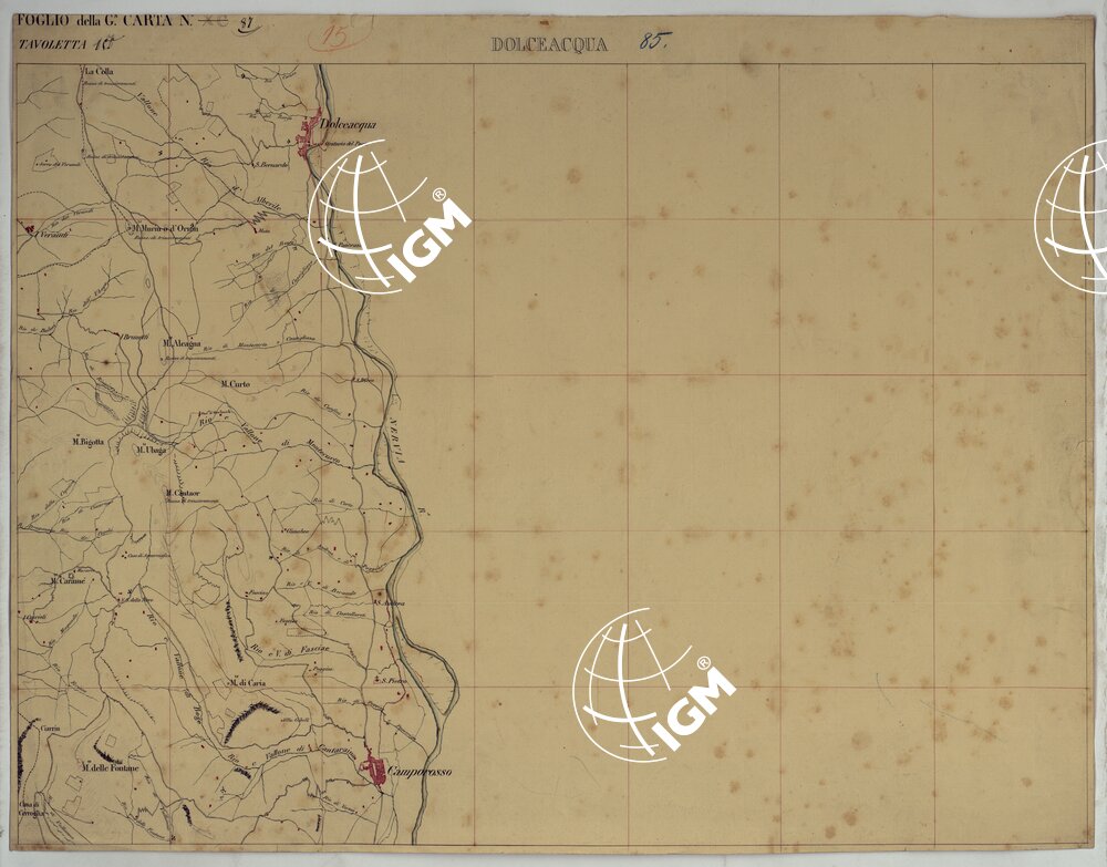 Rilievo regolare in 99 tavolette (minute di campagna) del territorio della Contea di Nizza. Il rilievo è dimostrato a curve orizzontali, tracciate all’equidistanza di 10 metri. Gli operatori furono ufficiali di armi diverse, probabilmente allievi della Scuola di S. M. : Avet, Albert, Borson, Basso, Bergalli, Costanze, Cordon, Ceva, Colli, Carderina, Cordero, Coda, Di Pralormo, Dal Pozzo, De Fornari, De Candia, D’Angennes, Escoffier, Federici, Falicon, Govone, La Grange, La Fleche, Muletti, Marazzano, Mazè, Morozzo, Mariani, Pictet, Ponzani, Piola Caselle, Righini, Rinaudo, Ricci, S. Andrea, Somis, Villamarina.