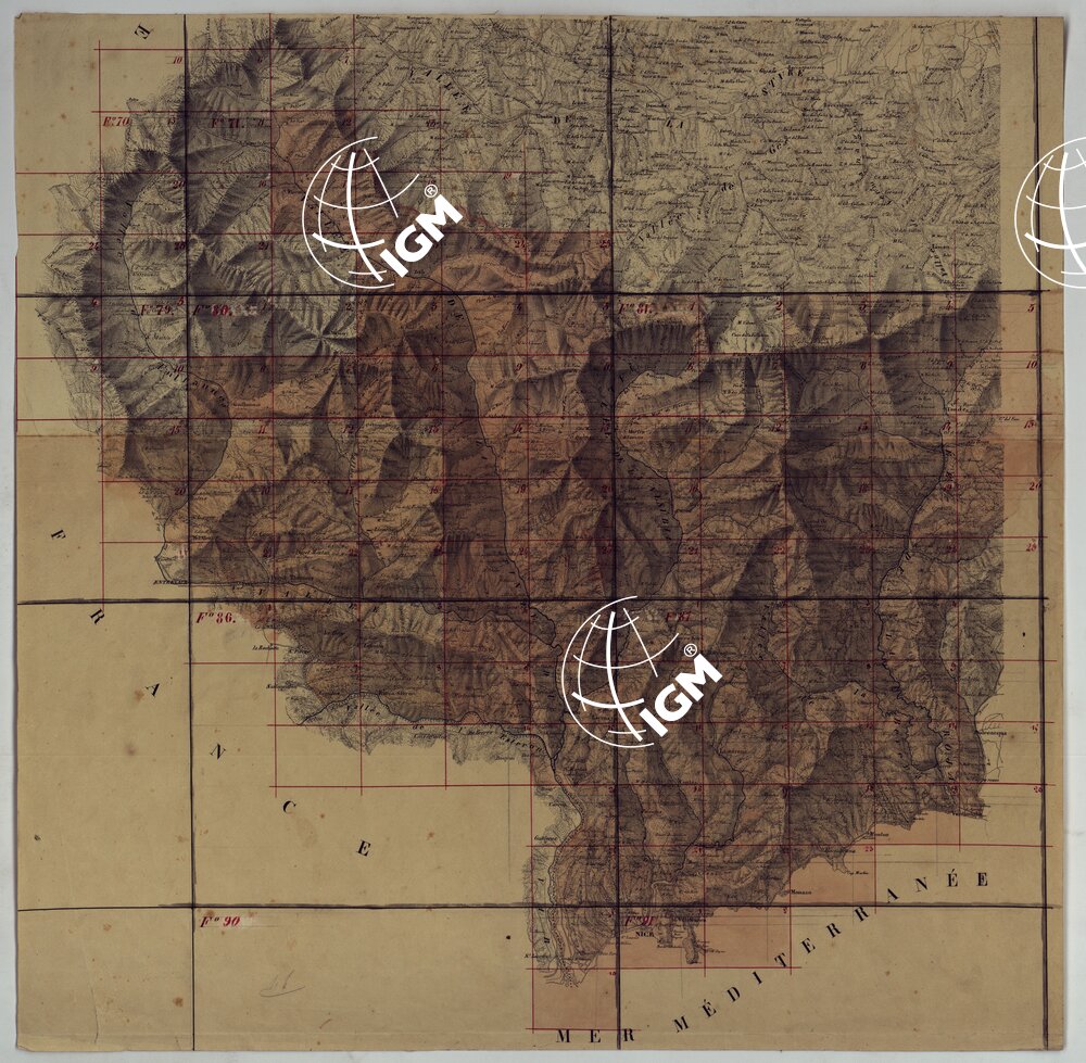Rilievo regolare in 99 tavolette (minute di campagna) del territorio della Contea di Nizza. Il rilievo è dimostrato a curve orizzontali, tracciate all’equidistanza di 10 metri. Gli operatori furono ufficiali di armi diverse, probabilmente allievi della Scuola di S. M. : Avet, Albert, Borson, Basso, Bergalli, Costanze, Cordon, Ceva, Colli, Carderina, Cordero, Coda, Di Pralormo, Dal Pozzo, De Fornari, De Candia, D’Angennes, Escoffier, Federici, Falicon, Govone, La Grange, La Fleche, Muletti, Marazzano, Mazè, Morozzo, Mariani, Pictet, Ponzani, Piola Caselle, Righini, Rinaudo, Ricci, S. Andrea, Somis, Villamarina.