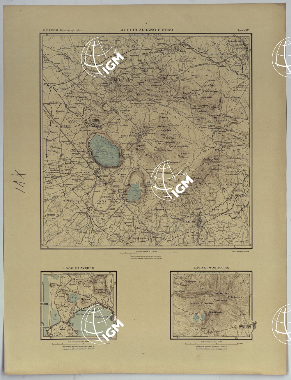ATLANTE DEI LAGHI ITALIANI TAV XVI 2° COPIA LAGHI DI ALBANO E NEMI DI MONTICCHIO E DI AVERNO
