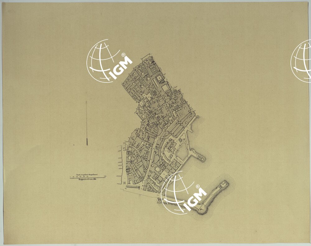 Epoca 1861-65. Carta in dodici fogli piu' cinque fogli senza indicazioni. tratti da incisione su pietra stampati in nero. Essa venne iniziata nel 1853 ed ultimata nel 1864. L'orografia è rappresentata col tratteggio e con le curve di livello. Ciascun foglio reca il proprio titolo, un elenco numerico delle principali costruzioni, la scala grafica in palmi napoletani e la data di pubblicazione.