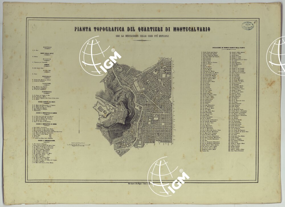CARTA DEI DODICI QUARTIERI DI NAPOLI – PIANTA TOPOGRAFICA DEL QUARTIERE MONTECALVARIO CON LA INDICAZIONE DELLE COSE PIU' NOTABILI.