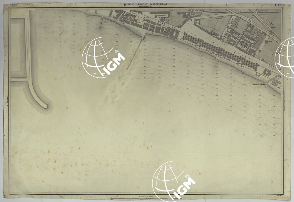 La carta si compone di 23 fogli incisi su rame stampati in nero. Essa fu costruita a cura del Municipio di Napoli sotto la direzione del Prof. di Geodesia C. Schiavoni, iniziata nel 1863 e ultimata verso il 1870. L’orografia è rappresentata col tratteggio e curve di livello tracciate all’equidistanza di m. 2. Gli scandagli sono calcolati in metri. Due copie una delle quali in fogli montati su tela e con curve batometriche (Docum. n. 15). Il titolo non è presente sulla carta.