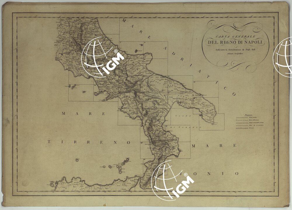 Una delle copie d’archivio segnate col N°5 reca tracciate a colori le strade costruite, in costruzione, in progetto, e le ferrovie, fino a tutto il 1855 come indicato nella tavola intitolata:”Carta Generale del Regno di Napoli indicante la distribuzione dei fogli sciolti montati su tela. La copia d’archivio N°6 è pure in fogli sciolti ma non montati su tela. Le tre copie inventariate coi N. 49, 49 bis e 49 ter sono rispettivamente in fogli sciolti, fogli su tela a stacchi sotto custodia. I fogli N. 7,8,11,12,16,20 della copia N°49 ter sono in duplicato aggiornati per la rete stradale a tutto il 1855. Annesse la riproduzioni dei fogli 7,8,11,12,15,16 eseguite dall’I.G.M. nel 1930. La copia N°4585 è in fogli montati su tela a stacchi contenuti in busta.