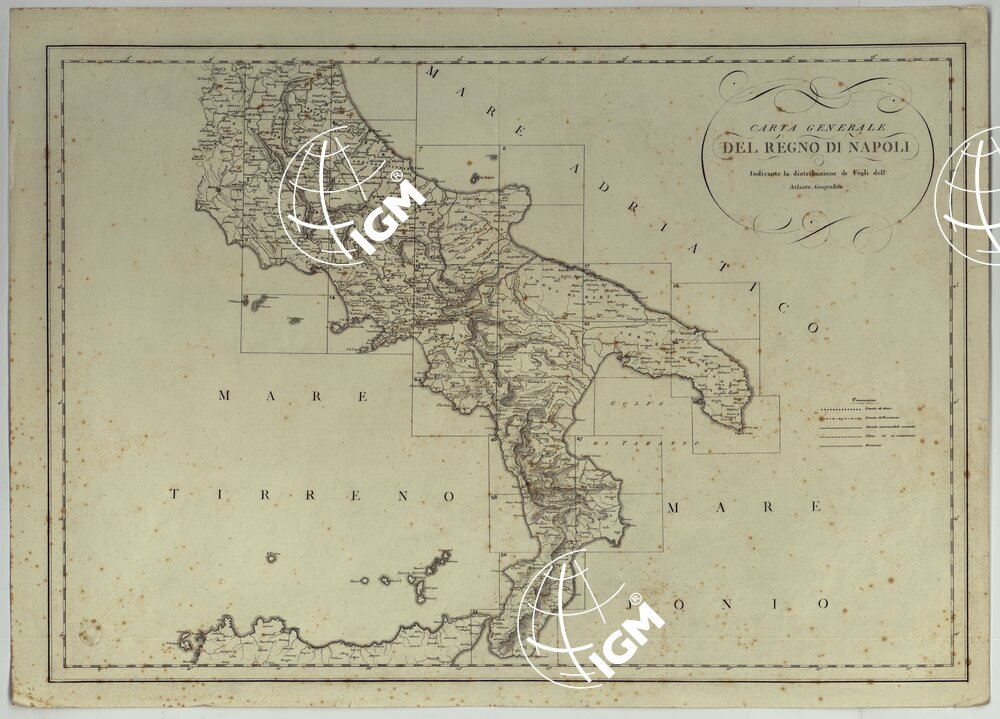 Una delle copie d’archivio segnate col N°5 reca tracciate a colori le strade costruite, in costruzione, in progetto, e le ferrovie, fino a tutto il 1855 come indicato nella tavola intitolata:”Carta Generale del Regno di Napoli indicante la distribuzione dei fogli sciolti montati su tela. La copia d’archivio N°6 è pure in fogli sciolti ma non montati su tela. Le tre copie inventariate coi N. 49, 49 bis e 49 ter sono rispettivamente in fogli sciolti, fogli su tela a stacchi sotto custodia. I fogli N. 7,8,11,12,16,20 della copia N°49 ter sono in duplicato aggiornati per la rete stradale a tutto il 1855. Annesse la riproduzioni dei fogli 7,8,11,12,15,16 eseguite dall’I.G.M. nel 1930. La copia N°4585 è in fogli montati su tela a stacchi contenuti in busta.