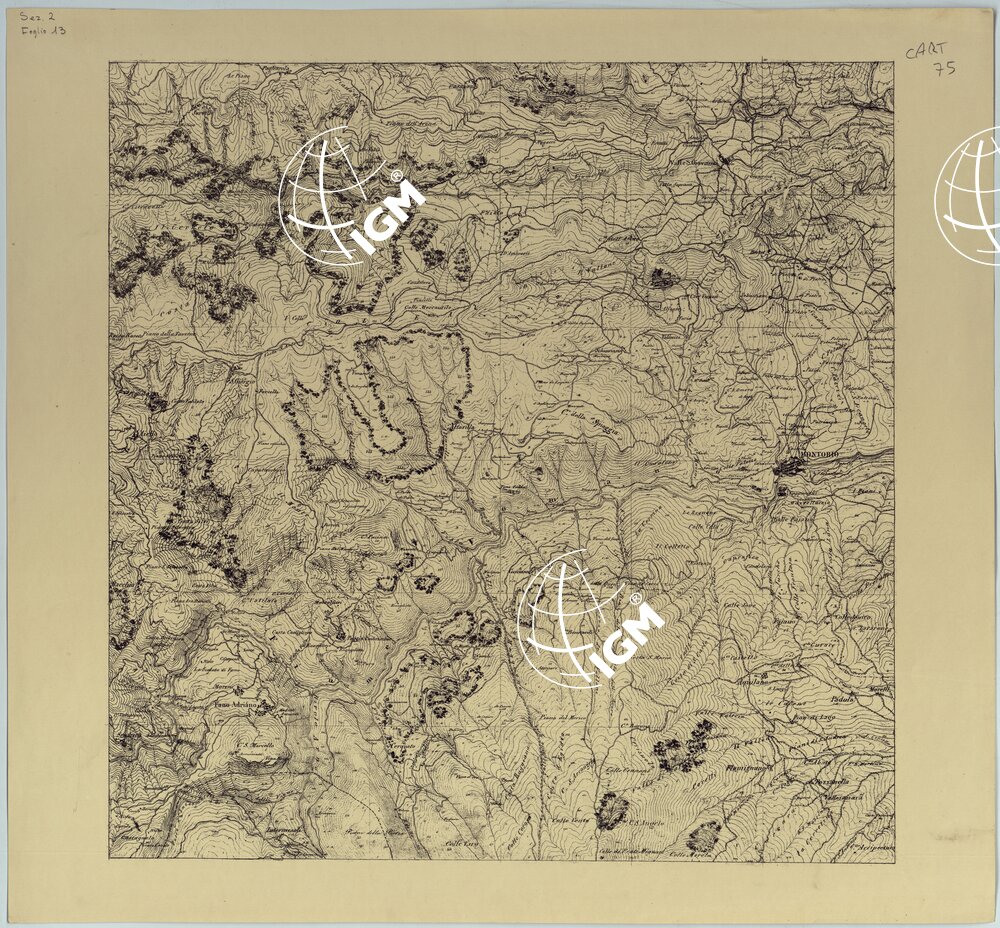 Sono 120 tavolette montate su tela o seta, copiate e messe in netto all’Officio Topografico di Napoli su le levate eseguite dal 1834 al 1860 per la formazione della Carta del Reame di Napoli alla scala di 1:80.000. L’esecuzione di questa carta venne decretata nel 1814: essa fu però iniziata, dati i movimenti politici di quell’epoca, soltanto nel 1833. Queste tavolette si riferiscono ai fogli 1, 5, 8, 9, 12, 13, 17-19, 28, 29, 33 della suddetta carta la quale doveva essere disegnata ed incisa su rame a bulino in fogli rettangolari con orografia a tratteggio e curve di livello tracciate alla equidistanza di 10 passi (m. 18,52) o di 52 passi (m. 92,60). Di essa peraltro furono pubblicati solamente cinque fogli, cioè: Napoli, Caserta, Gaeta, Leonessa, Cittaducale, tra il 1861 e 1870. L’I.G.M. conserva i rami dei primi tre di questi fogli. La carta all’80.000, pregevolissima per valore artistico e scientifico, venne giudicata superiore alle altre produzioni cartografiche contemporanee non solo italiane, ma europee (cfr. Mori A., La cartografia ufficiale in Italia e l’I.G.M. 1922, pag.107).