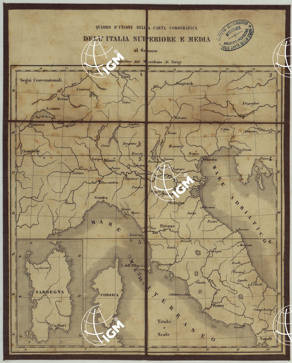 Subito dopo le prime annessioni del 1859 il Governo sentì il bisogno di avere una carta generale di tutte le provincie dell’alta e media Italia recentemente annesse. E siccome il tempo stringeva si pensò di approfittare dei materiali già esistenti per comporla al più presto. Perciò presso l’Ufficio superiore di Stato Maggiore (Torino) vennero completati i quattro rami già esistenti della “Carta corografica delle Alpi” annessa all’opera: “Le Alpi che cingano l’Italia.” Per il quinto foglio si trasse partito della carta dell’Isola di Sardegna del Generale Alberto La Marmora. Per il resto si fece una riduzione della corrispondente parte della carta austriaca dell’Italia centrale alla scala di 1:86.400 e per la parte napoletana di quella del Rizzi Zannoni alla scala di un decimetro per 6 miglia geografiche di 60 al grado. Furono preventivamente introdotte sui rami e nelle riduzioni le principali varianti riscontrate nella topografia e nel sistema stradale ed idrografico dei paesi rappresentanti. Le montagne ed i principali eccedenti del terreno si sono indicati col tratteggio a luce obliqua. I meridiani tracciati si riferiscano all’Osservatorio di Parigi, ma sui margini dei fogli vi è anche la graduazione referentesi all’Osservatorio di Torino. I rami incisi, avendo servito alla stampa di centinaia di copie sono ormai logori.